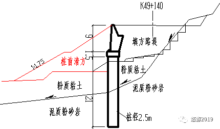 2.2、由于路肩部位下伏软弱地基承载力较低,故若仅设置桩板墙支挡势必造成滑体以上抗滑桩的悬臂长大21m(全桩长32.5m),这是非常不科学的和不经济的。故为有效减小工程规模,决定在路肩部位设置桩基托梁挡墙进行支挡。其中抗滑桩对路堤填方的整体稳定性进行支挡(桩长21m),并为上部的挡墙提供承载力。桩基上部的挡墙(墙高9.0m)只对其墙后的填方土压力进行支挡,即只考虑局部稳定性问题,从而大大减小了工程规模。