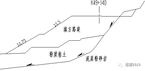 某路基为半填半挖段,挖方坡体主要由中厚层状、产状近水平的白垩系泥质粉砂岩构成。填挖交界面自然坡度较陡,填方设置于厚度约4~10.0m、以崩坡积和残坡积为主形成的粉质粘土层和少量碎石土层,堆积体地形上呈缓斜、梯状水田状,可塑~软塑状,填方高度最大约16.5m,采用1:1.5~1:1.75的稳定坡率填筑,填方总体积约1.4万方。